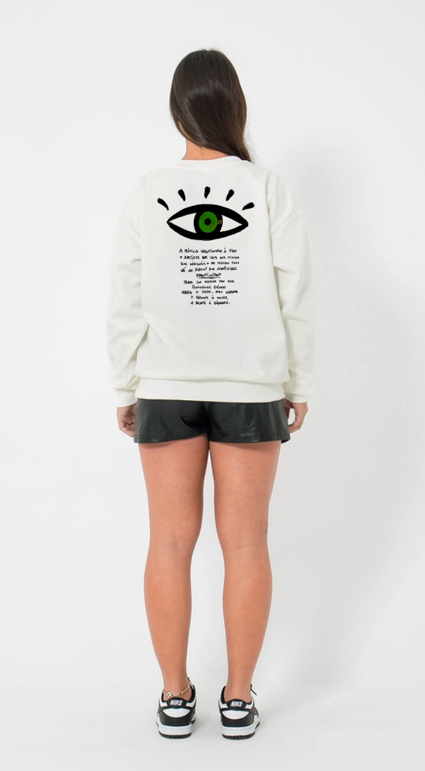 Moletom Careca 2 Cabos com estampa OLHO SOLO centralizada no peito e OLHO FRASES ocupando as costas. Disponível na cor creme com estampa colorida. Design místico com modelagem careca 2 cabos.